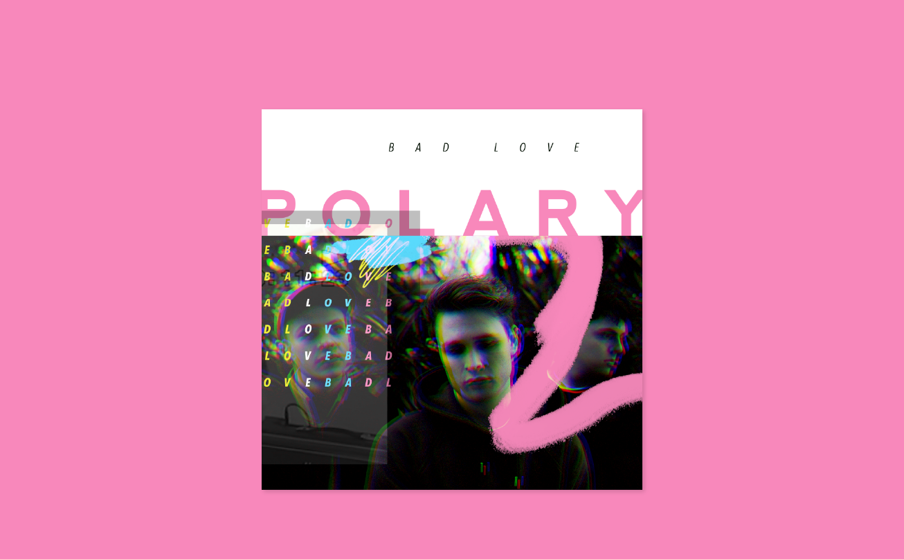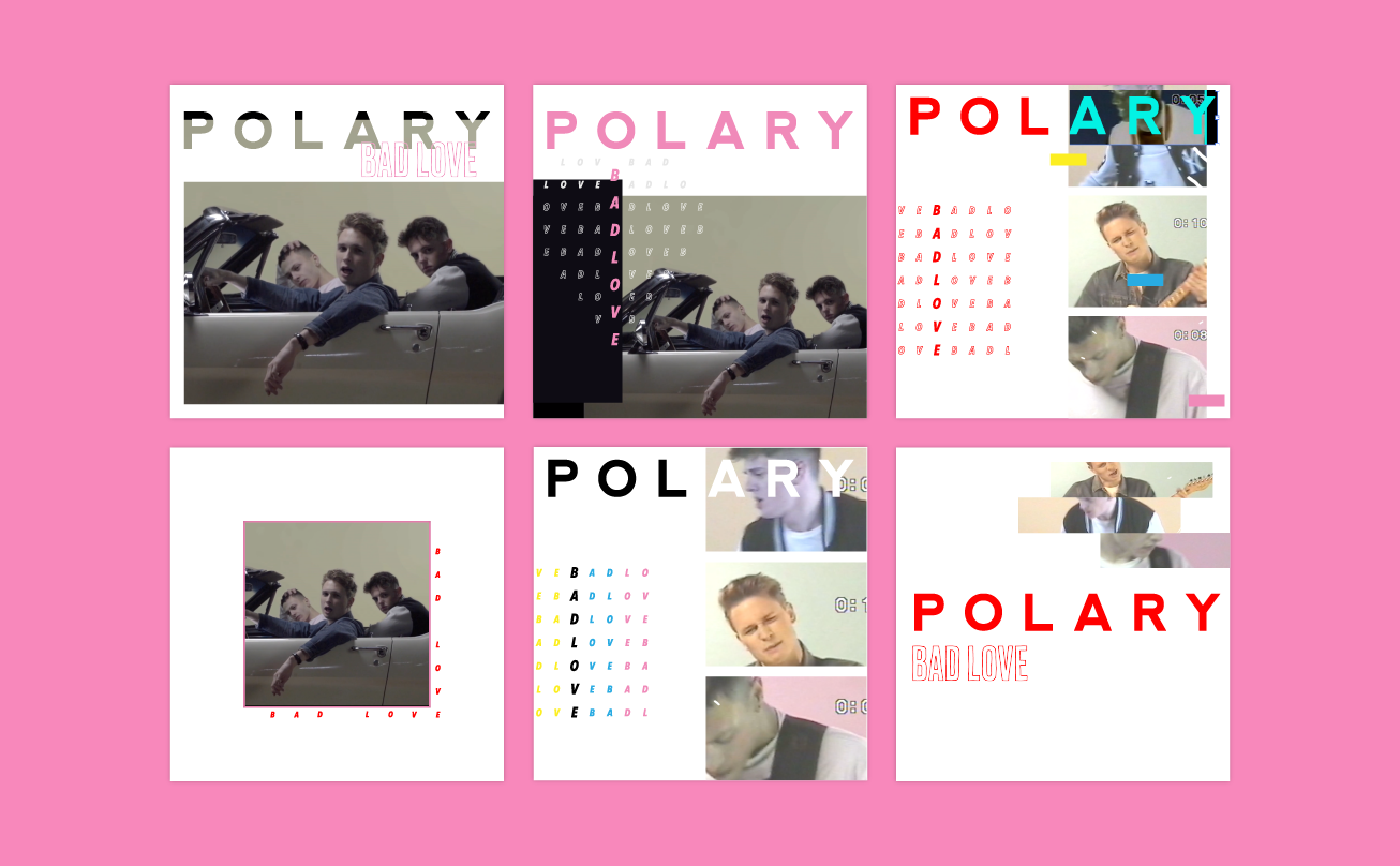 Final single artwork and a series of drafts for the Polary release 'Bad Love'. A very late request and quick turnaround for the digital market based on the stills and graphics featured in the band's video.